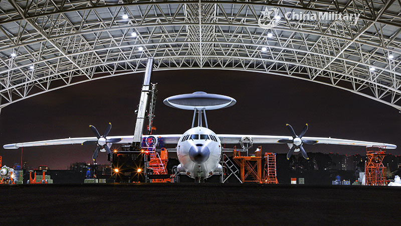 A KJ-500 airborne early warning (AEW) aircraft attached to an aviation division with the PLA Navy receives seasonal maintenance in its hangar in late December. (eng.chinamil.com.cn/Photo by Zhang Dingyi)