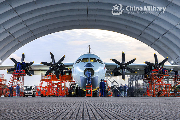 Maintenance men assigned to an aviation division with the PLA Navy perform inspections on an anti-submarine patrol aircraft in the hangar in late December. (eng.chinamil.com.cn/Photo by Zhang Dingyi)