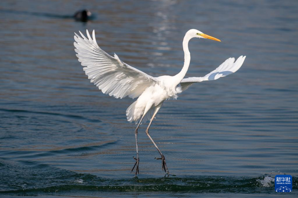 An egret is seen at Fenhe river wetland park in Taiyuan, north China's Shanxi Province, Dec. 28, 2021. (Xinhua/Yang Chenguang)