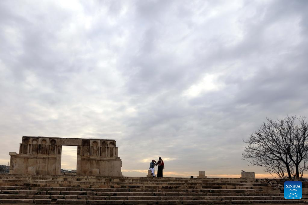 People visit the Citadel archaeological site in Amman, Jordan, on Dec. 28, 2021. (Photo by Mohammad Abu Ghosh/Xinhua)