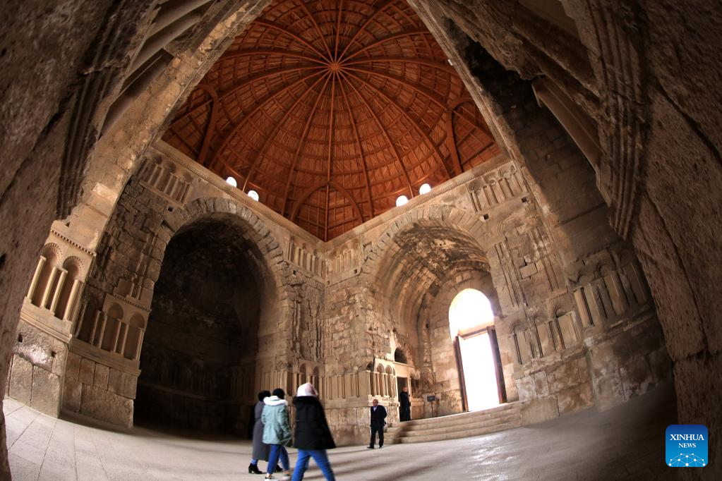People visit the Citadel archaeological site in Amman, Jordan, on Dec. 28, 2021. (Photo by Mohammad Abu Ghosh/Xinhua)