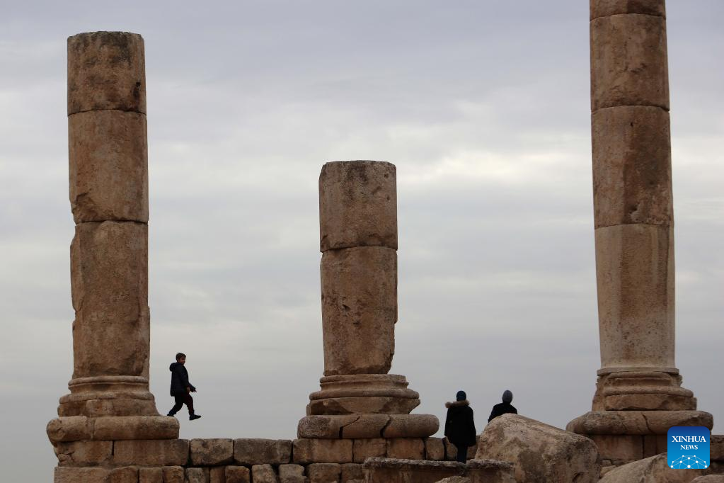 People visit the Citadel archaeological site in Amman, Jordan, on Dec. 28, 2021. (Photo by Mohammad Abu Ghosh/Xinhua)
