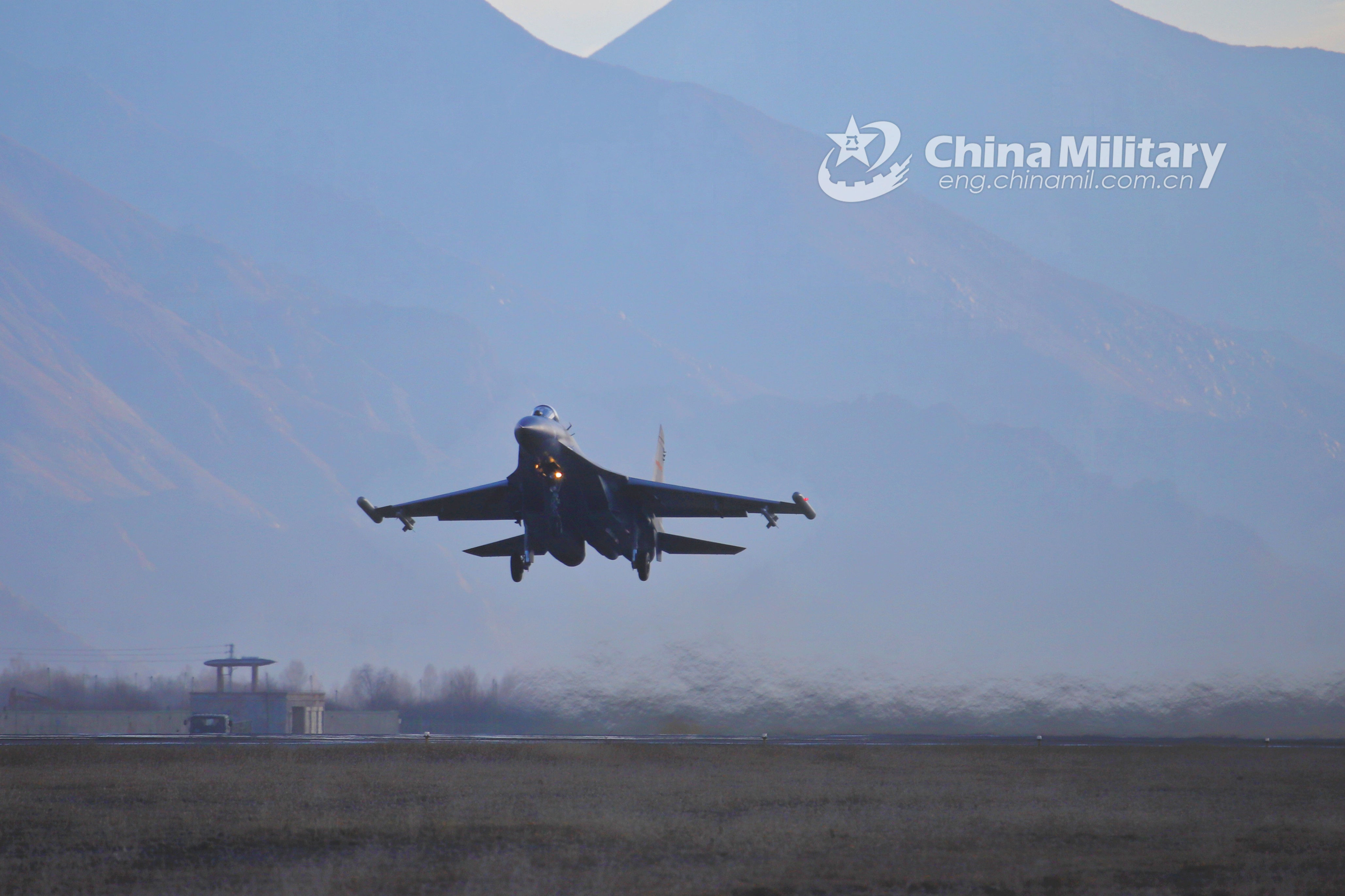 A fighter jet attached to an aviation brigade of the air force under the PLA Western Theater Command takes off for a flight training mission from December 21 to 22, 2021. (eng.chinamil.com.cn/Photo by Wen Rui)