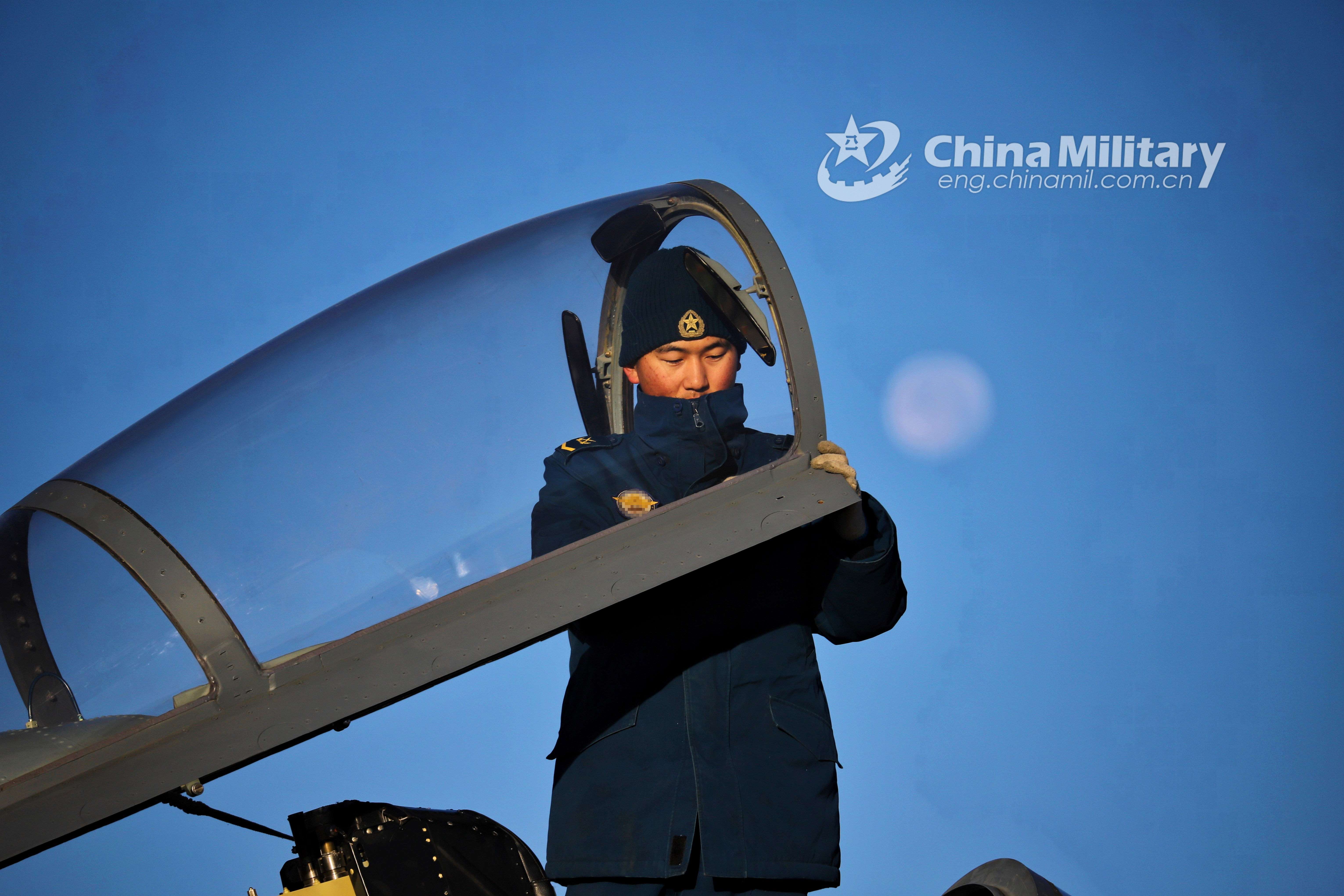 A ground crew member assigned to an aviation brigade of the air force under the PLA Western Theater Command inspects the canopy of a fighter jet prior to a flight training mission from December 21 to 22, 2021. (eng.chinamil.com.cn/Photo by Wen Rui)