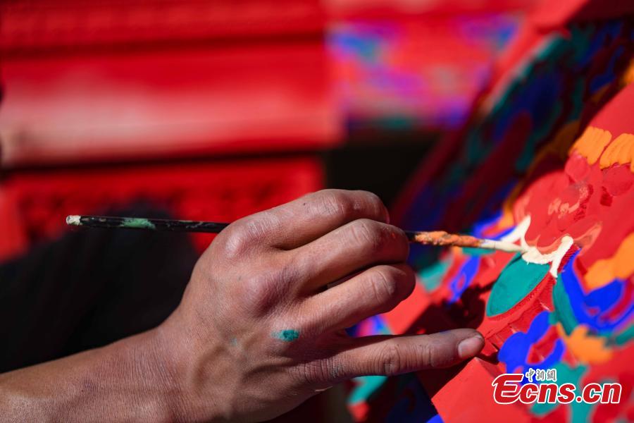 Folk craftspeople from a handcraft cooperative draw Tibetan trims on furniture in Lhasa, southwest China's Tibet Autonomous Region, Dec. 28, 2021. (Photo/China News Service)
