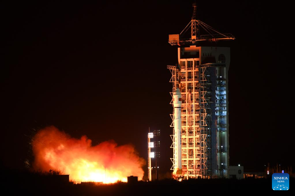 A Long March-2D carrier rocket carrying the Tianhui-4 satellite blasts off from the Jiuquan Satellite Launch Center in northwest China, Dec. 29, 2021. China on Wednesday successfully sent the Tianhui-4 satellite into space from the Jiuquan Satellite Launch Center. The satellite was launched at 7:13 p.m. (Beijing Time) and has entered its planned orbit. (Photo by Wang Jiangbo/Xinhua)