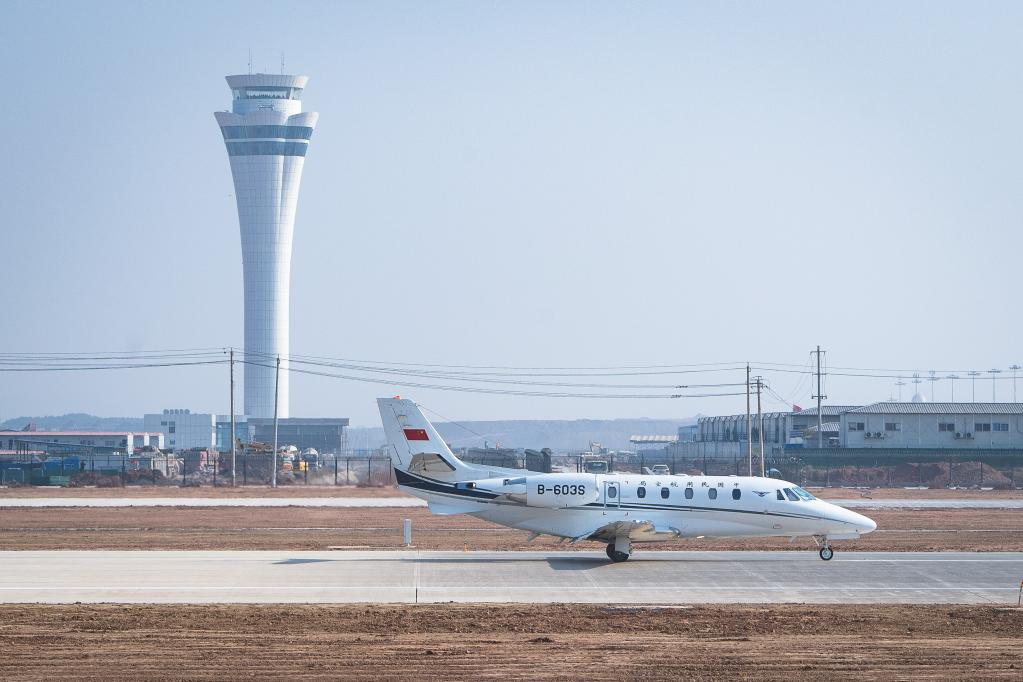 A Cessna 560 airplane lands at the Ezhou Huahu Airport in Ezhou, central China's Hubei Province, Dec. 29, 2021. A Cessna 560 carried out flight verification of the Ezhou Huahu Airport on Wednesday, marking the completion of the cargo-oriented airport. The airport is the country's first cargo airport, with the functional orientation of the air cargo hub and feeder airport for passenger transport. It is also China's first airport project that introduces social capital and enterprises. (Xinhua/Xiao Yijiu)