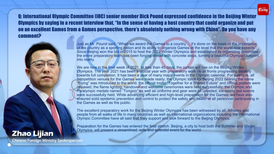 Preparation for the Beijing Winter Olympics has entered the home stretch, a Foreign Ministry spokesperson said on Wednesday, adding that Beijing, a city to host both the Summer and Winter Olympics, will present a streamlined, safe and splendid event for the world.