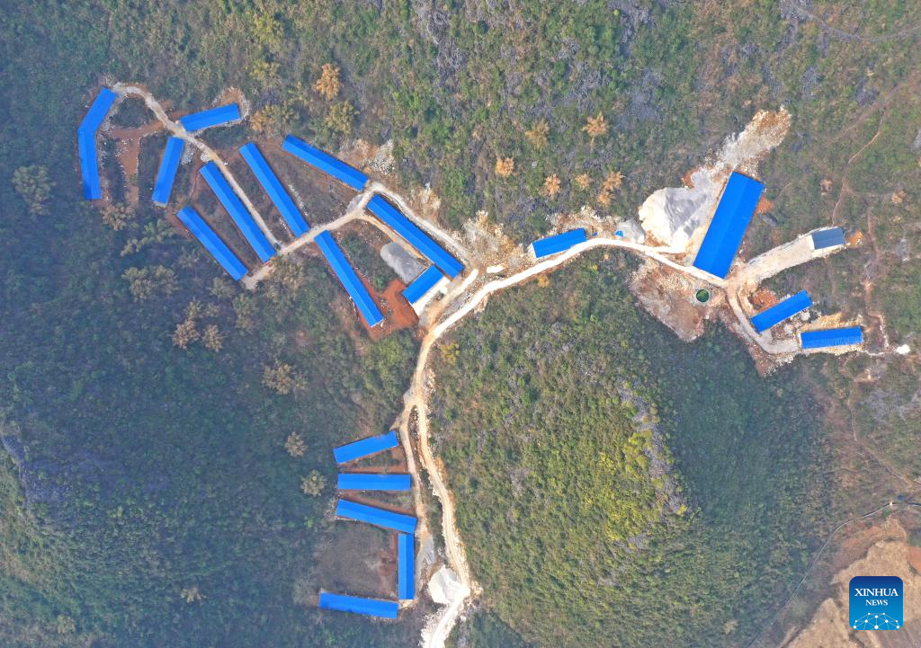 Aerial photo taken on Jan. 20, 2021 shows a chicken farm at Qingpo Village of Hechi City, south China's Guangxi Zhuang Autonomous Region. As Guangxi consolidates its achievements in poverty alleviation and goes all out for rural revitalization, fostering rural industries is of great significance of advancing income growth of rural residents. (Xinhua/Zhou Hua)
