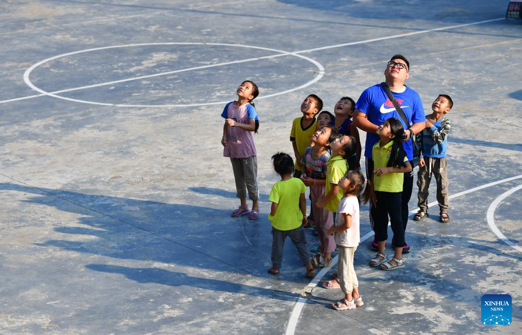 Zheng Changhao, who once worked as a local poverty alleviation official, operates a drone with children in Wuying Village on the border between south China's Guangxi Zhuang Autonomous Region and southwest China's Guizhou Province, on Oct. 2, 2021.