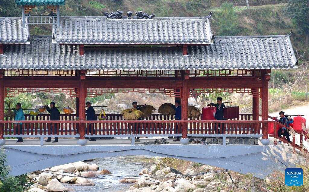 Villagers are on the way to a banquet with gifts on their shoulders in Wuying Village on the border between south China's Guangxi Zhuang Autonomous Region and southwest China's Guizhou Province, on Dec. 14, 2021.