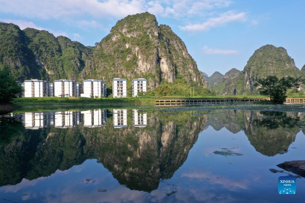 Aerial photo taken on Sept. 2, 2021 shows a relocation area in Dongmiao Township of Du'an Yao Autonomous County, south China's Guangxi Zhuang Autonomous Region. In 2021, Guangxi Zhuang Autonomous Region has made great efforts to accelerate improvement of rural living environment amid the bid to promote rural vitalization and upgrade the living conditions of rural residents. (Xinhua/Lu Boan)