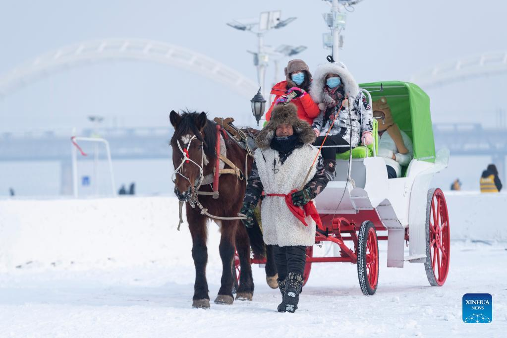 Tourists have fun on frozen Songhua River at an ice-snow theme park in Harbin, northeast China's Heilongjiang Province, Dec. 30, 2021. (Xinhua/Xie Jianfei)