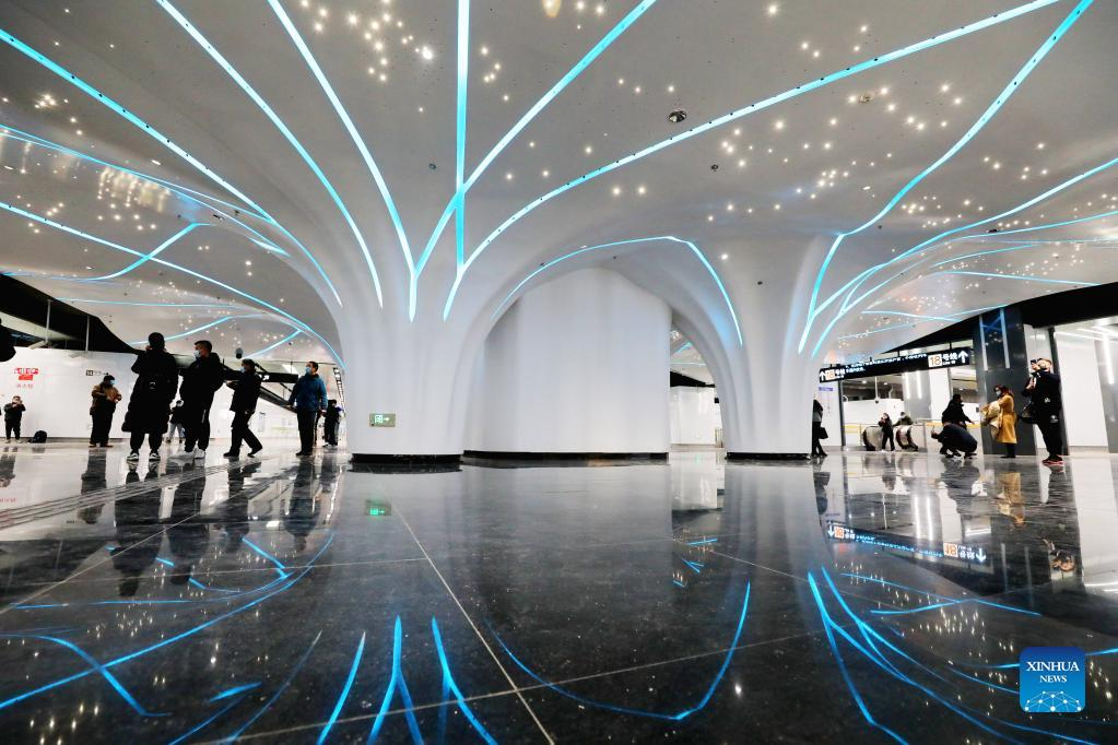Passengers transfer at Changyi Road Station on metro Line 14 and Line 18 in east China's Shanghai, Dec. 30, 2021. Two new metro lines went into operation Thursday in Shanghai, which brings the total length of Shanghai's metro network to 831 km, solidifying its world-leading status, according to Shanghai Metro. The opening of the two new lines will bring the total number of fully automatic metro lines in Shanghai to five, with an operating length of 167 km, ranking first in the world for the first time, Shanghai Metro added. (Xinhua/Fang Zhe)