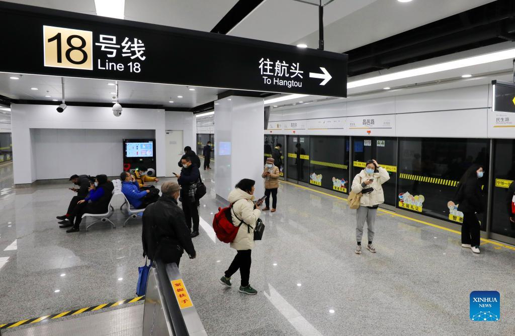 Passengers wait for the train at Changyi Road Station on metro Line 18 in east China's Shanghai, Dec. 30, 2021. Two new metro lines went into operation Thursday in Shanghai, which brings the total length of Shanghai's metro network to 831 km, solidifying its world-leading status, according to Shanghai Metro. The opening of the two new lines will bring the total number of fully automatic metro lines in Shanghai to five, with an operating length of 167 km, ranking first in the world for the first time, Shanghai Metro added. (Xinhua/Fang Zhe)