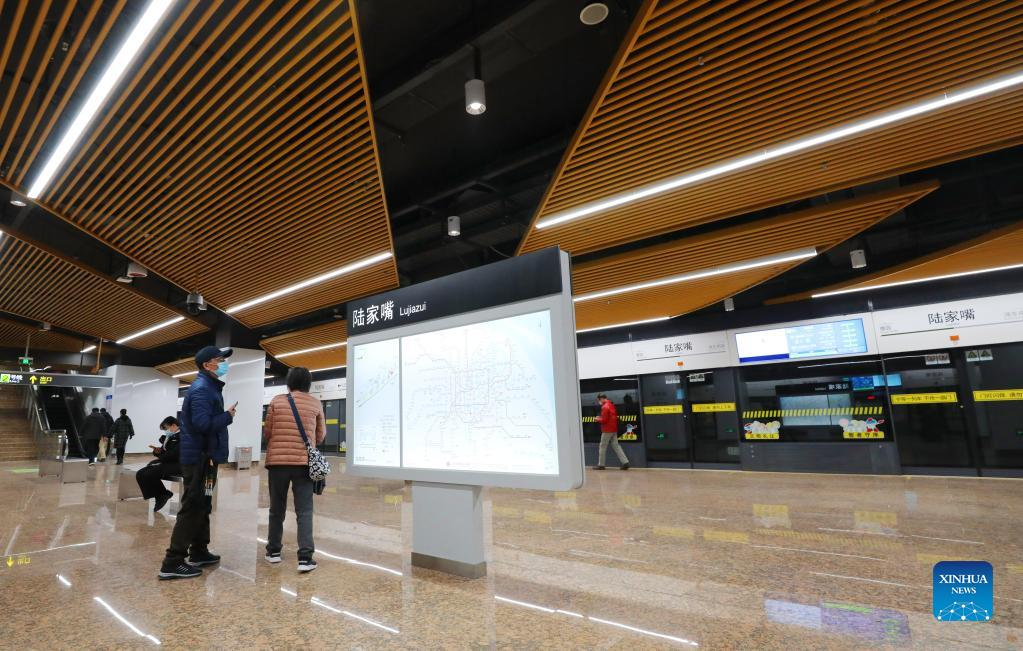 Passengers look at a map at Lujiazui Station on metro Line 14 in east China's Shanghai, Dec. 30, 2021. Two new metro lines went into operation Thursday in Shanghai, which brings the total length of Shanghai's metro network to 831 km, solidifying its world-leading status, according to Shanghai Metro. The opening of the two new lines will bring the total number of fully automatic metro lines in Shanghai to five, with an operating length of 167 km, ranking first in the world for the first time, Shanghai Metro added. (Xinhua/Fang Zhe)