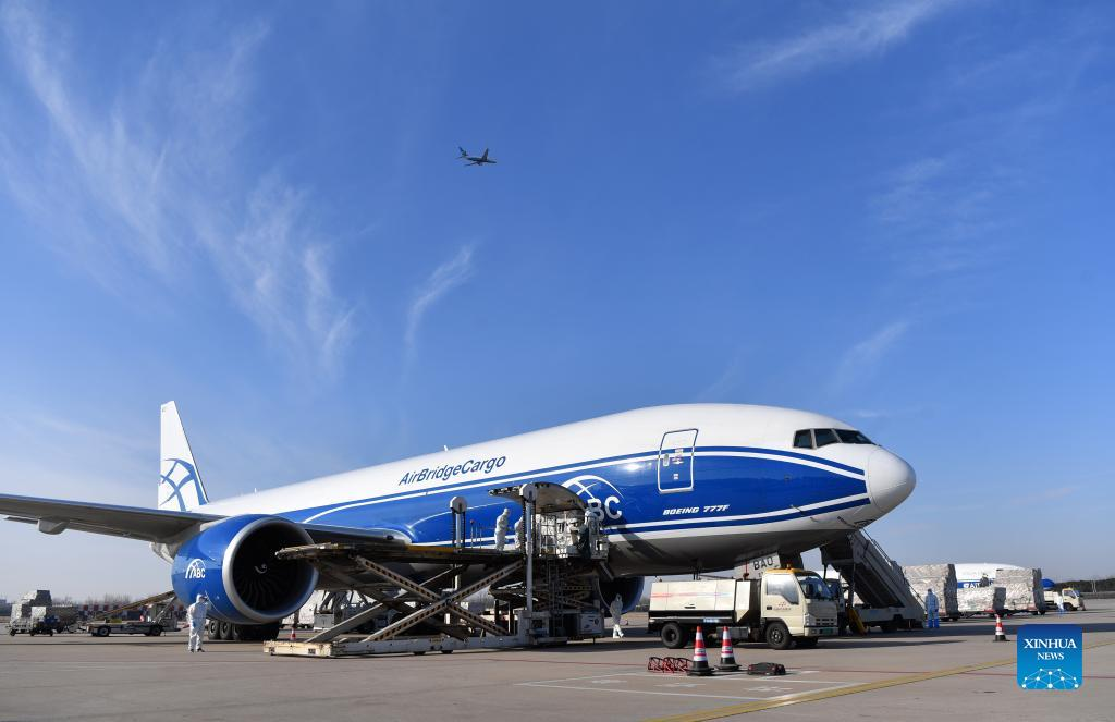 Staff prepare to load an air freighter of Russian AirBridgeCargo at Xinzheng International Airport in Zhengzhou, central China's Henan Province, Dec. 30, 2021. The annual cargo throughput of Xinzheng International Airport in Zhengzhou of Henan exceeded 700,000 tonnes Thursday. (Xinhua/Li Jianan)