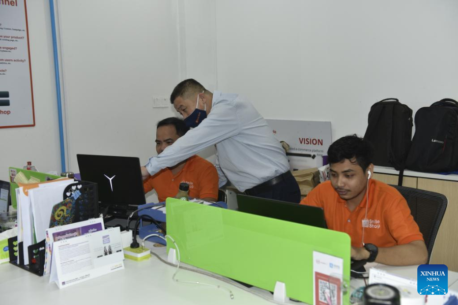 Jack Lee (C) trains his employees in Phnom Penh, Cambodia, Dec. 21, 2021. The Regional Comprehensive Economic Partnership (RCEP), which is due to enter into force on Jan. 1, 2022, will promote cross-border e-commerce and narrow the development gap between developed and developing countries, said Jack Lee, chief executive officer and founder of online market Smile Shop in Cambodia.