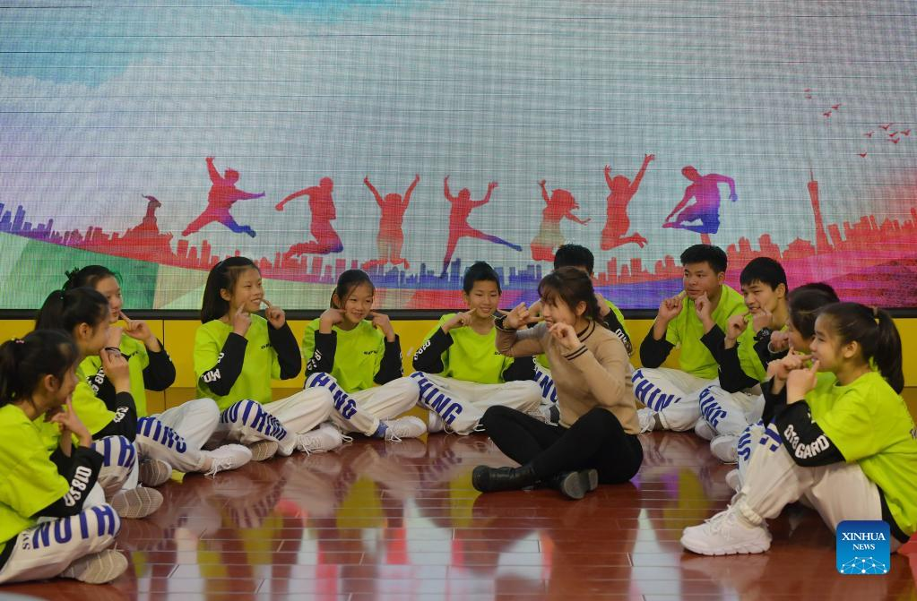 Fan Haiyan and her students communicate in sign language at the special education school in Yichun City of east China's Jiangxi Province, Dec. 28, 2021. Fan Haiyan, a teacher of the special education school in Yichun City, learned sign language in her spare time to improve her teaching of students with hearing impairment. After years of practice, Fan could convey message quickly and correctly to her students when creating choreography or rehearsing dance routines. Fan and her students have participated in many art competitions these years, through which these children have found happiness and self-confidence. (Xinhua/Peng Zhaozhi)