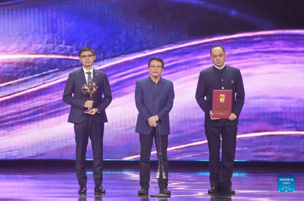 Representatives for the film "Island Keeper" receive the Best Feature Film Award at the awarding ceremony of the 34th China Film Golden Rooster Awards in Xiamen, southeast China's Fujian Province, Dec. 30, 2021. The awarding ceremony of the 34th China Film Golden Rooster Awards was held in Xiamen on Thursday. (Xinhua/Lin Shanchuan)