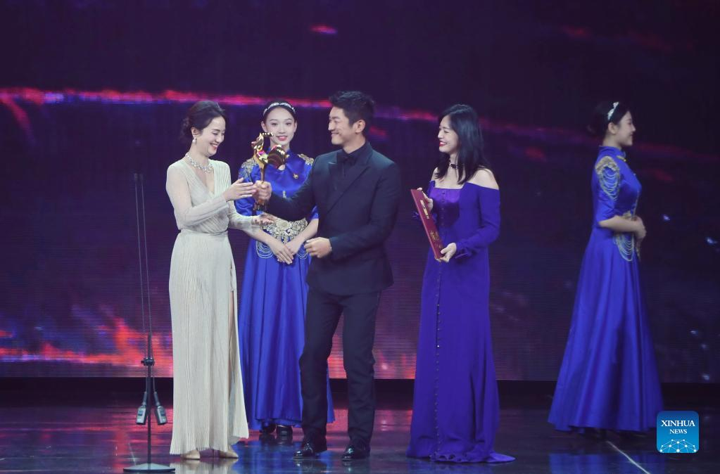 Photo taken on Dec. 30, 2021 shows the awarding ceremony of the 34th China Film Golden Rooster Awards in Xiamen, southeast China's Fujian Province. The awarding ceremony of the 34th China Film Golden Rooster Awards was held in Xiamen on Thursday. (Xinhua/Lin Shanchuan)