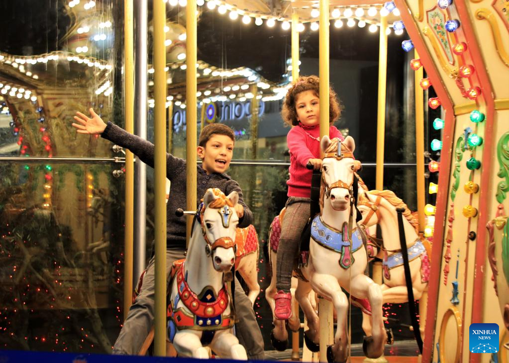Children ride a merry-go-round in a shopping mall on the outskirts of Beirut, Lebanon, Dec. 30, 2021. (Xinhua/Liu Zongya)
