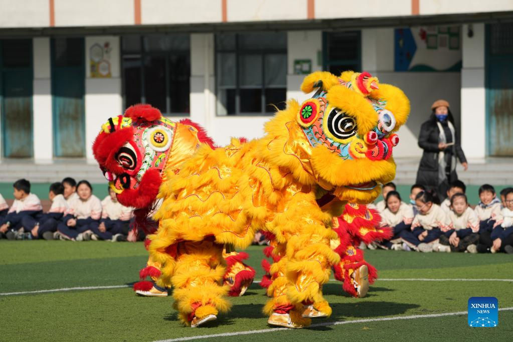 Students perform lion dance to celebrate the New Year at an elementary school in Hefei, east China's Anhui Province, Dec. 31, 2021. People across China organize various kinds of activities to greet the upcoming New Year. (Xinhua/Du Yu)