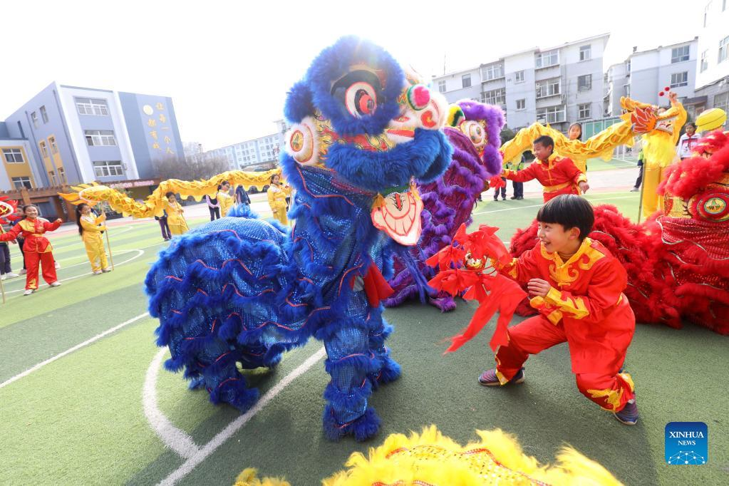 Students perform lion dance to celebrate the New Year at an elementary school in Shijiazhuang, north China's Hebei Province, Dec. 31, 2021. People across China organize various kinds of activities to greet the upcoming New Year. (Photo by Liang Zidong/Xinhua)