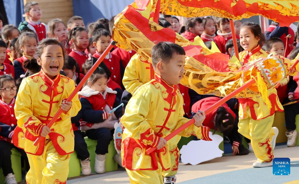 Children perform dragon dance to celebrate the New Year at a kindergarten in Huzhou, east China's Zhejiang Province, Dec. 31, 2021. People across China organize various kinds of activities to greet the upcoming New Year. (Photo by Xie Shangguo/Xinhua)