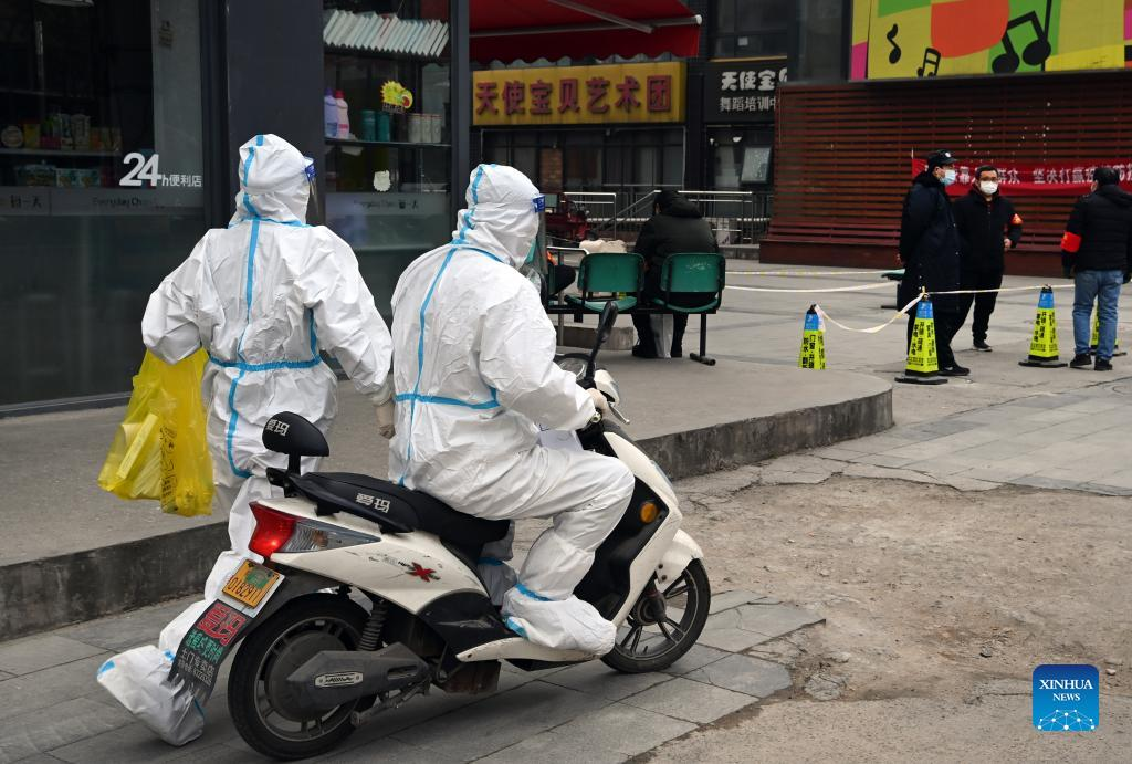 A staff member of a drug store rides a bicycle to deliver medicine in Xi'an, northwest China's Shaanxi Province, Dec. 31, 2021. Xi'an imposed closed-off management for communities and villages on Dec. 23 in an effort to curb the spread of the latest COVID-19 resurgence. (Xinhua/Tao Ming)