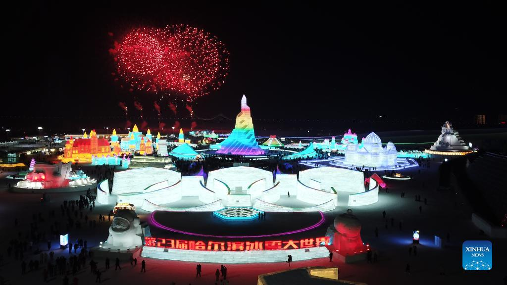 Aerial photo taken on Dec. 31, 2021 shows a firework show to celebrate the New Year at the Harbin Ice-Snow World in Harbin, northeast China's Heilongjiang Province. (Xinhua/Wang Jianwei)