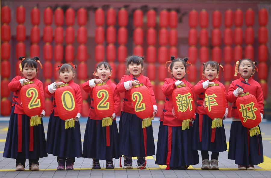 Children hold red lanterns during a New Year celebration at a kindergarten in Suining, southwest China's Sichuan Province, Dec. 31, 2021. (Photo by Liu Changsong/Xinhua)
