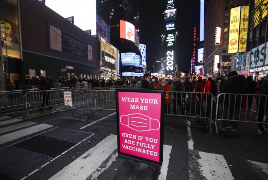 A sign of wearing mask is set up during the New Year celebrations at Times Square in New York, the United States, Dec. 31, 2021. (Xinhua/Wang Ying)