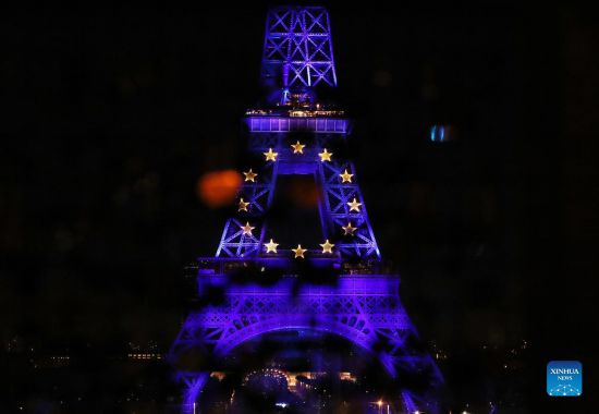The Eiffel Tower is lit up in blue to celebrate the start of the French presidency of the European Union in Paris, France, Jan. 1, 2022. The most emblematic landmarks in France turned blue Saturday night to mark French presidency of the EU. (Xinhua/Gao Jing)