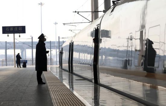 A staff member stands on the platform of Shijiazhuang Railway Station in Shijiazhuang, north China's Hebei Province, Jan. 1, 2022. (Photo by Liang Zidong/Xinhua)