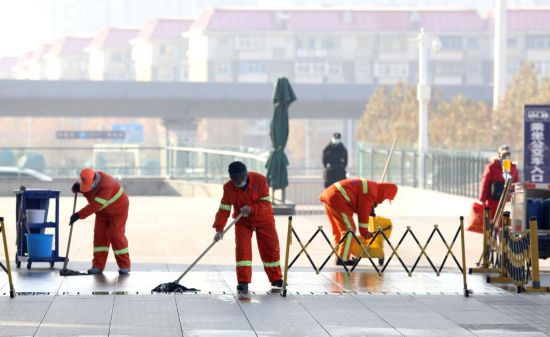 Sanitation workers clean the floor outside Shijiazhuang Railway Station in Shijiazhuang, north China's Hebei Province, Jan. 1, 2022. (Photo by Liang Zidong/Xinhua)
