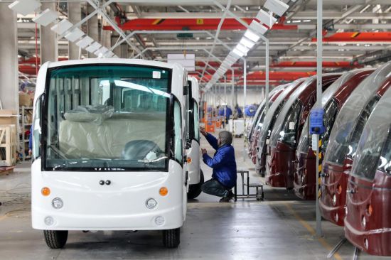 A worker works at an electric car factory in Huaibei, east China's Anhui Province, Jan. 1, 2022. (Photo by Wan Shanchao/Xinhua)