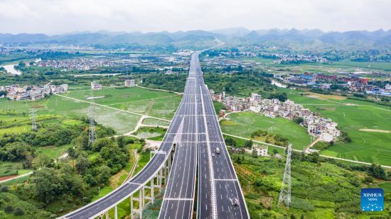 Aerial photo taken on June 28, 2021 shows cars running on the Huishui Bridge of the Duyun-Anshun expressway in southwest China's Guizhou Province. The total length of expressways in Guizhou Province exceeded 8,000 kilometers. (Xinhua/Tao Liang)
