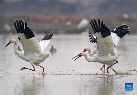 White cranes frolic at a white crane conservation area by the Poyang Lake in Nanchang, east China's Jiangxi Province, Jan. 1, 2022. (Xinhua/Wan Xiang)