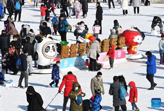 People enjoy themselves at an ice and snow carnival held in Taoranting Park during the New Year holiday in Beijing, capital of China, Jan. 2, 2022. (Xinhua/Li He)