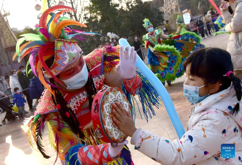 Children interact with performers at an animal-themed park in Zhengzhou, central China's Henan Province, Jan. 2, 2022. (Xinhua/Zhu Xiang)