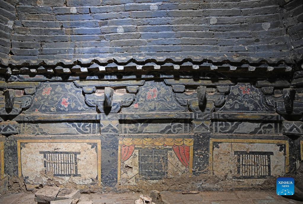 Undated photo provided by the Shanxi provincial institute of archaeology shows murals in a tomb chamber in Luzhou District of Changzhi City, north China's Shanxi Province.(Xinhua)