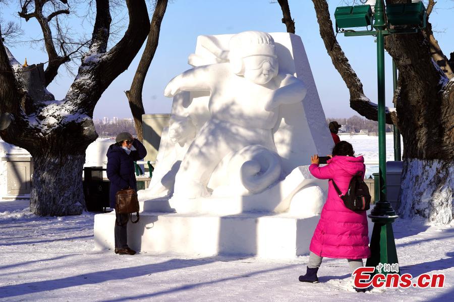 Tourists take photos with a snow sculpture shaped in a skiing athlete in Harbin, northeast China's Heilongjiang Province, Jan. 2, 2022. (Photo: China News Service/Sun Hanlun)