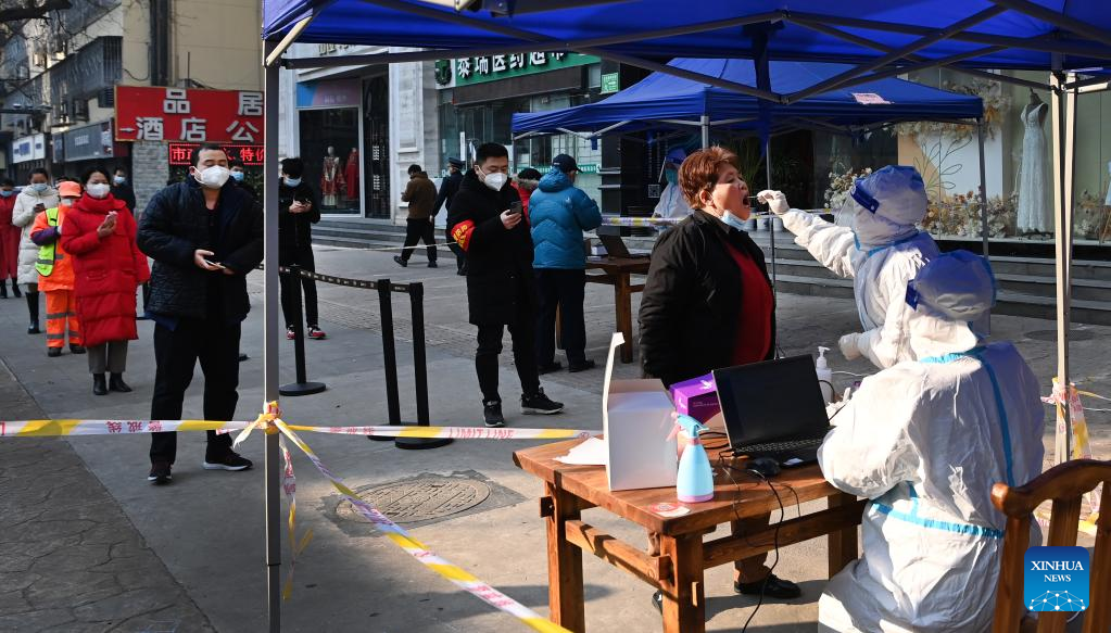 A medical worker collects swab sample from a citizen for nucleic acid testing at a mobile testing site in Xincheng District of Xi'an, northwest China's Shaanxi Province, Jan. 2, 2022. (Xinhua/Tao Ming)