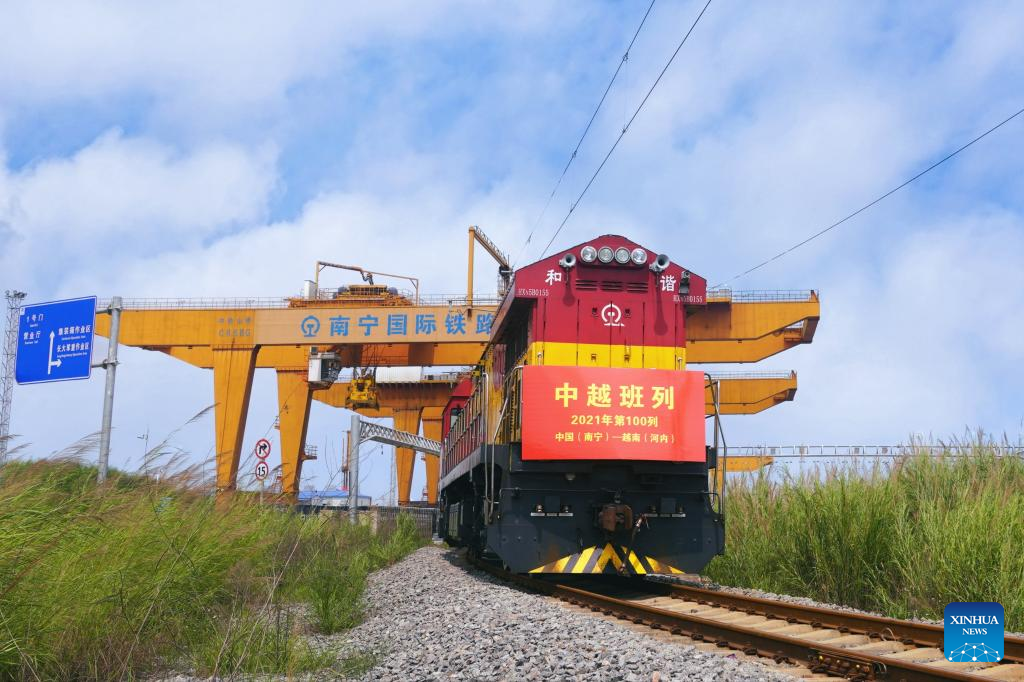 A China-Vietnam freight train pulls out of Nanning International Railway Port in Nanning, capital of south China's Guangxi Zhuang Autonomous Region, April 21, 2021. (China Railway Nanning Group Co., Ltd./Handout via Xinhua)