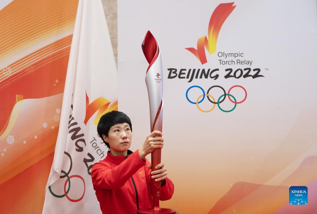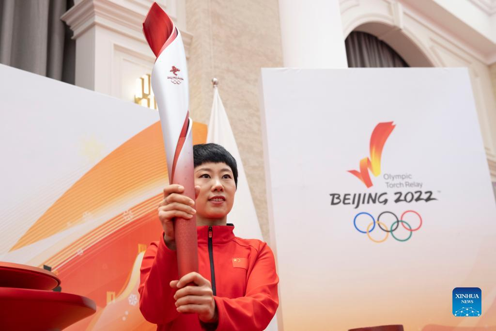 Short track speed skating Olympic champion Zhang Hui holds the torch during the Torch Exhibition Tour of Olympic Winter Games Beijing 2022 in Harbin, northeast China's Heilongjiang Province, Jan. 5, 2022. (Xinhua/Zhang Tao)