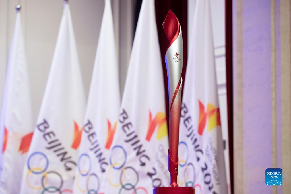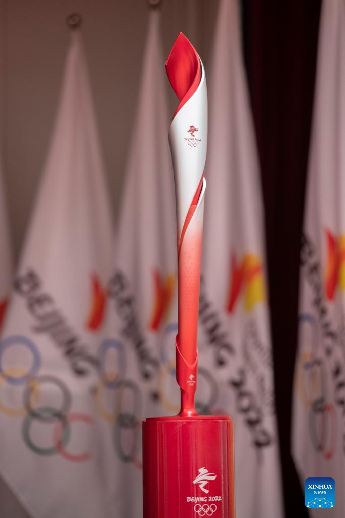 The torch is seen during the Torch Exhibition Tour of Olympic Winter Games Beijing 2022 in Harbin, northeast China's Heilongjiang Province, Jan. 5, 2022. (Xinhua/Zhang Tao)