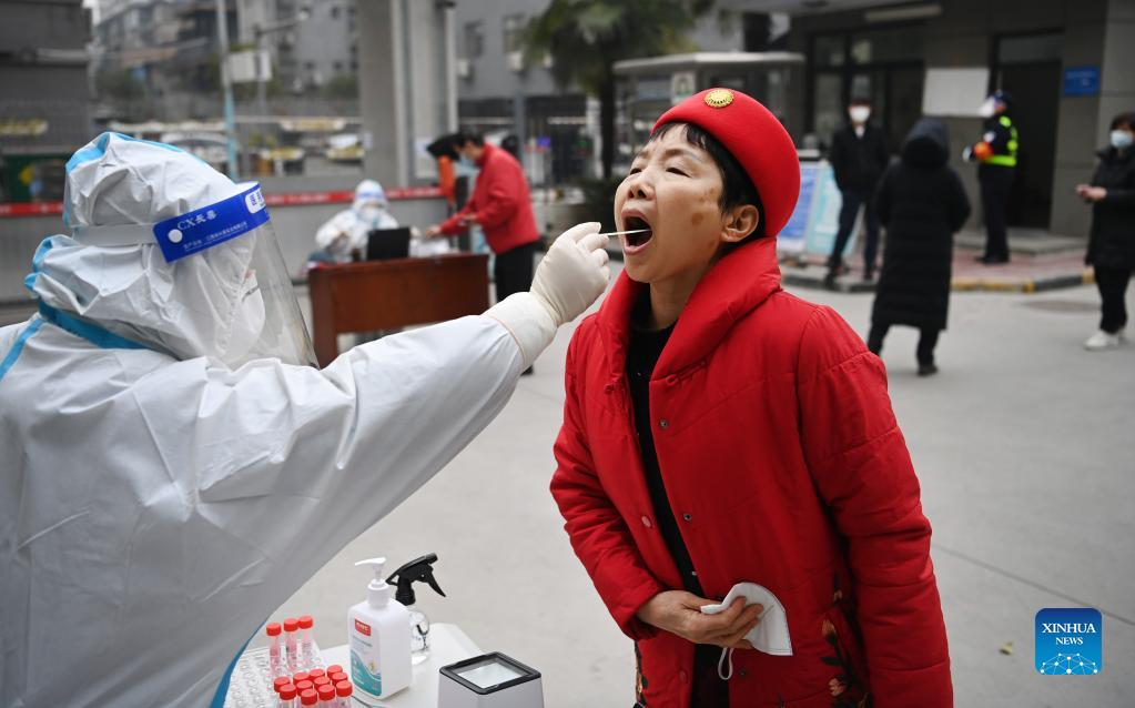 A resident receives nucleic acid test at a testing site in Xincheng District of Xi'an, northwest China's Shaanxi Province, Jan. 4, 2022. (Xinhua/Tao Ming)