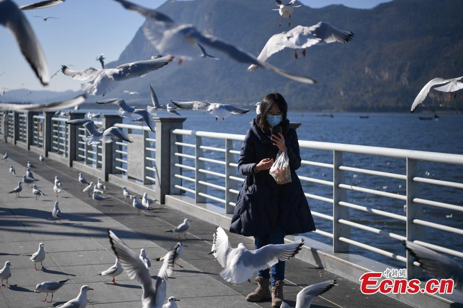 A Kunming citizen feeds the red-billed gulls at the bank of Dianchi Lake in Kunming, southwest China's Yunnan Province, Jan. 5, 2022. (Photo: China News Service/Liu Ranyang)