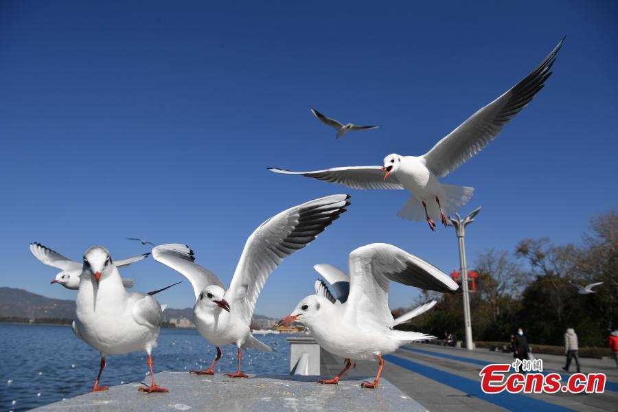 The migratory red-billed gulls are widely seen in southeast China's coastal regions and migrate to Kunming for hibernation in winter days.